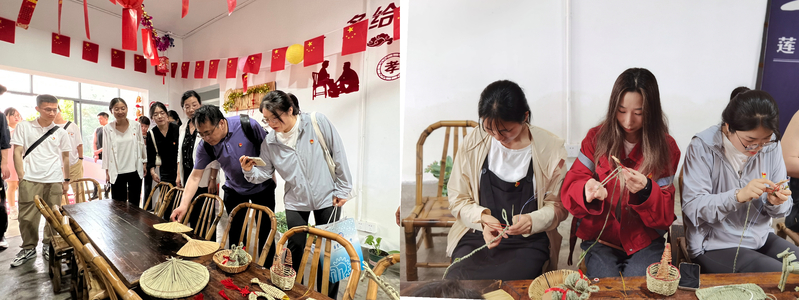 座谈会后,资环学院师生在金泽镇、莲湖村干部的讲解下开展“行走的大思政课”,实地参观了莲湖村人居环境、院士工作站、青西郊野公园水上森林、党群服务中心及沿途的现代特色农业,学生们还在“莲湖幸福驿站”参与了“非遗”文化“茭白叶绿色编织”活动,茭白叶编结是历史悠久的草编、柳编技艺的发展演变与当地茭白种植业相结合而出现的民间手工编结技艺,把废弃的茭叶通过绿色编结的方式,不仅消解利用了原本废弃的茭白叶、变废为宝,还保护了环境,现已成为当地新兴的特色农业产业。同学们一起动手编结实地见证了上海民间技艺的继承发展与创新发展,近距离感受莲湖村以生态文明建设引领乡村振兴的建设成果。