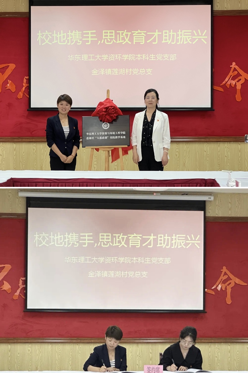 为扎实开展学习贯彻习近平新时代中国特色社会主义思想主题教育,加强校地联动,推进“大思政课”实践育人工作, 5月26日上午,pg电子官方网站资环学院与金泽镇莲湖村结对共建暨“大思政课”实践教学基地揭牌仪式在莲湖村村委会议室举行。金泽镇党委书记、我校95届校友方志坚,pg电子官方网站pg电子官方网站党委书记修光利出席并讲话。资环学院党委副书记曹娜、金泽镇党委副书记欧培莉、莲湖村党总支书记周红萍、资环学院本科生党支部书记李娜,以及本研思政辅导员和党员代表共同参加了此次活动。